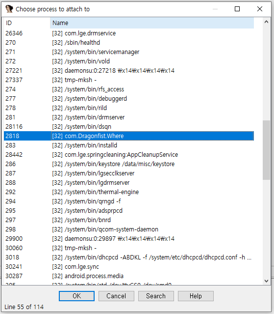 OK를 누르면 다음과 같이 해당 기기에서 실행 중인 프로세스 목록이 보이는데, 여기에서 디버깅할 프로세스를 선택하여 진행하시면 됩니다.