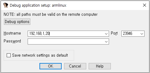 다음과 같은 창이 뜰 터인데, adb shell에 접속한 상태에서 network를 확인하여 알아낸 ip 주소를 적으면 됩니다.