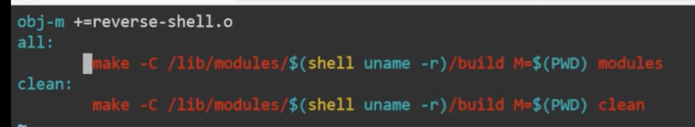해당 컨테이너 내에서 리버스 쉘 모듈을 컴파일한다. 리버스쉘 c 코드와 make 파일은 다음과 같다.